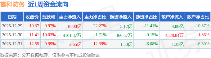 资金流向数据方面,本周雷科防务主力资金合计净流入12.24亿元,游资资金合计净流出6.46亿元,散户资金合计净流出5.78亿元。本周资金流向一览见下表: