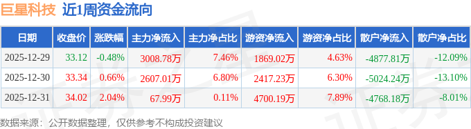 资金流向数据方面,本周巨星科技主力资金合计净流入5683.78万元,游资资金合计净流入8986.44万元,散户资金合计净流出1.47亿元。本周资金流向一览见下表: