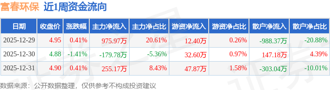 证券之星消息,截至2025年12月31日收盘,富春环保(002479)报收于4.9元,较上周的4.93元下跌0.61%。本周,富春环保12月29日盘中最高价报5.0元。12月30日盘中最低价报4.86元。富春环保当前最新总市值42.38亿元,在电力板块市值排名90/102,在两市A股市值排名3790/5181。