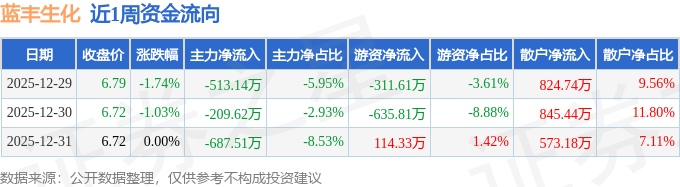 资金流向数据方面,本周蓝丰生化主力资金合计净流出1410.27万元,游资资金合计净流出833.09万元,散户资金合计净流入2243.36万元。本周资金流向一览见下表: