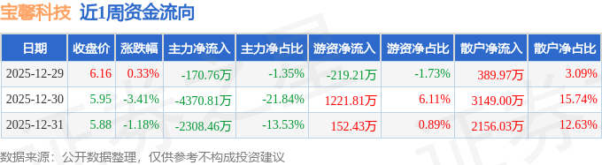 资金流向数据方面,本周宝馨科技主力资金合计净流出6850.02万元,游资资金合计净流入1155.03万元,散户资金合计净流入5694.99万元。本周资金流向一览见下表: