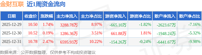 资金流向数据方面,本周金财互联主力资金合计净流入1.12亿元,游资资金合计净流出157.48万元,散户资金合计净流出1.1亿元。本周资金流向一览见下表: