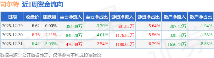 资金流向数据方面,本周司尔特主力资金合计净流出766.29万元,游资资金合计净流入2958.69万元,散户资金合计净流出2192.4万元。本周资金流向一览见下表: