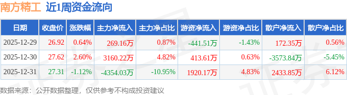 资金流向数据方面,本周南方精工主力资金合计净流出924.65万元,游资资金合计净流入1892.28万元,散户资金合计净流出967.64万元。本周资金流向一览见下表: