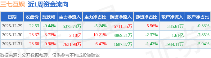 资金流向数据方面,本周三七互娱主力资金合计净流入2.33亿元,游资资金合计净流出845.74万元,散户资金合计净流出2.24亿元。本周资金流向一览见下表:
