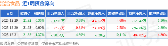资金流向数据方面,本周洽洽食品主力资金合计净流出682.86万元,游资资金合计净流入658.33万元,散户资金合计净流入24.54万元。本周资金流向一览见下表: