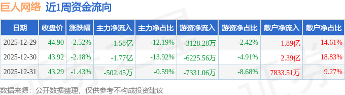 证券之星消息,截至2025年12月31日收盘,巨人网络(002558)报收于43.29元,较上周的46.06元下跌6.01%。本周,巨人网络12月29日盘中最高价报46.42元。12月31日盘中最低价报43.16元。巨人网络当前最新总市值837.55亿元,在游戏板块市值排名2/26,在两市A股市值排名204/5181。