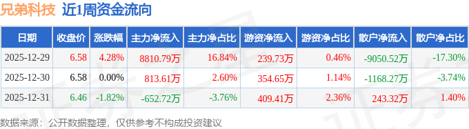 资金流向数据方面,本周兄弟科技主力资金合计净流入8971.68万元,游资资金合计净流入1003.79万元,散户资金合计净流出9975.47万元。本周资金流向一览见下表:
