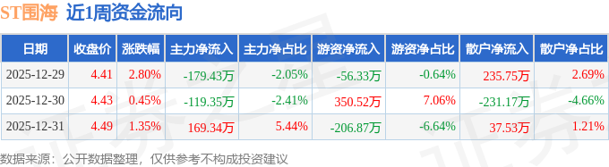 资金流向数据方面,本周ST围海主力资金合计净流出129.44万元,游资资金合计净流入87.32万元,散户资金合计净流入42.12万元。本周资金流向一览见下表: