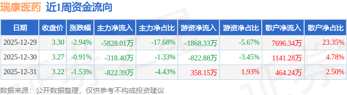 资金流向数据方面,本周瑞康医药主力资金合计净流出6968.8万元,游资资金合计净流出2333.06万元,散户资金合计净流入9301.86万元。本周资金流向一览见下表: