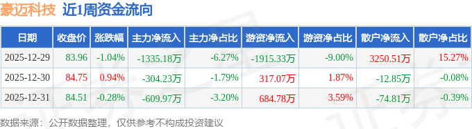 资金流向数据方面,本周豪迈科技主力资金合计净流出2249.37万元,游资资金合计净流出913.48万元,散户资金合计净流入3162.85万元。本周资金流向一览见下表: