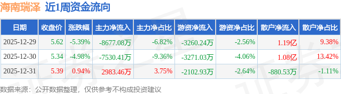 资金流向数据方面,本周海南瑞泽主力资金合计净流出1.32亿元,游资资金合计净流出8634.2万元,散户资金合计净流入2.19亿元。本周资金流向一览见下表: