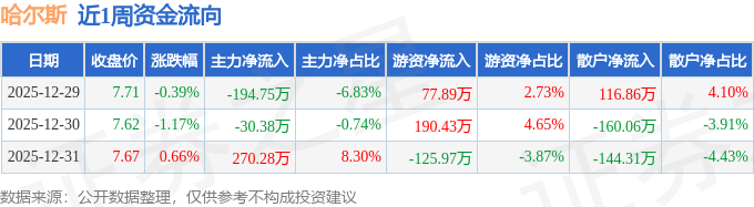资金流向数据方面,本周哈尔斯主力资金合计净流入45.15万元,游资资金合计净流入142.35万元,散户资金合计净流出187.5万元。本周资金流向一览见下表: