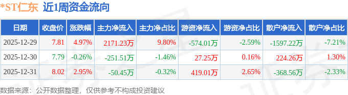 资金流向数据方面,本周*ST仁东主力资金合计净流入1869.27万元,游资资金合计净流出127.74万元,散户资金合计净流出1741.52万元。本周资金流向一览见下表: