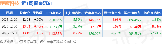 资金流向数据方面,本周博彦科技主力资金合计净流出444.39万元,游资资金合计净流出87.97万元,散户资金合计净流入532.36万元。本周资金流向一览见下表: