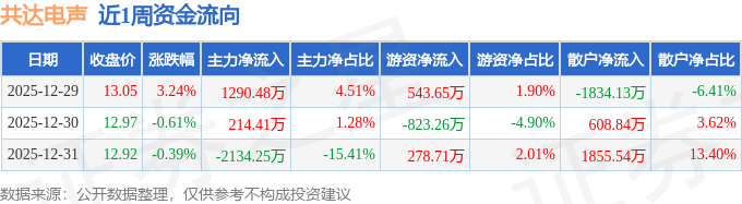 资金流向数据方面,本周共达电声主力资金合计净流出629.35万元,游资资金合计净流出0.9万元,散户资金合计净流入630.25万元。本周资金流向一览见下表: