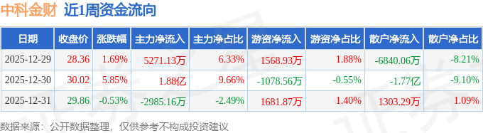 证券之星消息,截至2025年12月31日收盘,中科金财(002657)报收于29.86元,较上周的27.89元上涨7.06%。本周,中科金财12月30日盘中最高价报30.98元。12月29日盘中最低价报27.63元。中科金财当前最新总市值101.54亿元,在IT服务板块市值排名43/119,在两市A股市值排名1886/5181。