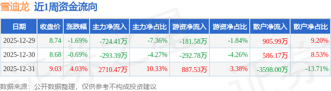 资金流向数据方面,本周雪迪龙主力资金合计净流入1692.67万元,游资资金合计净流入413.17万元,散户资金合计净流出2105.84万元。本周资金流向一览见下表: