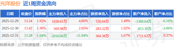 资金流向数据方面,本周光洋股份主力资金合计净流出415.42万元,游资资金合计净流入917.73万元,散户资金合计净流出502.31万元。本周资金流向一览见下表: