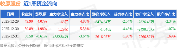 资金流向数据方面,本周牧原股份主力资金合计净流入2.44亿元,游资资金合计净流出1.63亿元,散户资金合计净流出8058.36万元。本周资金流向一览见下表: