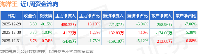 资金流向数据方面,本周海洋王主力资金合计净流入467.06万元,游资资金合计净流出247.73万元,散户资金合计净流出219.34万元。本周资金流向一览见下表: