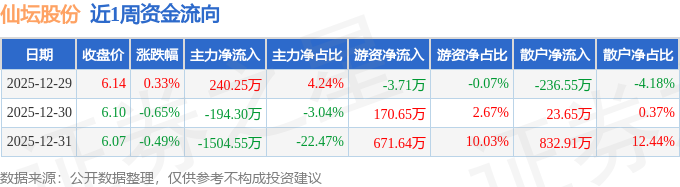 资金流向数据方面,本周仙坛股份主力资金合计净流出1458.59万元,游资资金合计净流入838.59万元,散户资金合计净流入620.01万元。本周资金流向一览见下表: