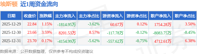 资金流向数据方面,本周埃斯顿主力资金合计净流入2231.59万元,游资资金合计净流出614.72万元,散户资金合计净流出1616.87万元。本周资金流向一览见下表: