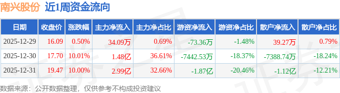 资金流向数据方面,本周南兴股份主力资金合计净流入4.47亿元,游资资金合计净流出2.62亿元,散户资金合计净流出1.85亿元。本周资金流向一览见下表: