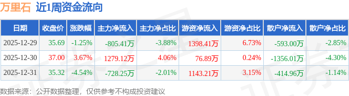 资金流向数据方面,本周万里石主力资金合计净流出254.54万元,游资资金合计净流入2618.51万元,散户资金合计净流出2363.97万元。本周资金流向一览见下表: