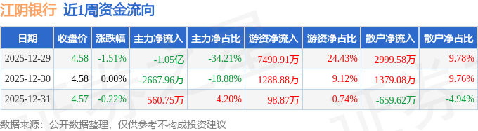 资金流向数据方面,本周江阴银行主力资金合计净流出1.26亿元,游资资金合计净流入8878.66万元,散户资金合计净流入3719.04万元。本周资金流向一览见下表: