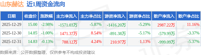 资金流向数据方面,本周山东赫达主力资金合计净流入688.46万元,游资资金合计净流出2096.61万元,散户资金合计净流入1408.15万元。本周资金流向一览见下表: