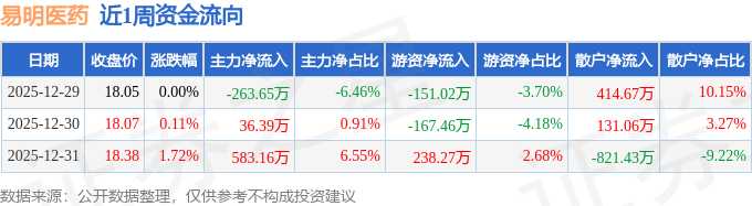 资金流向数据方面,本周易明医药主力资金合计净流入355.91万元,游资资金合计净流出80.21万元,散户资金合计净流出275.7万元。本周资金流向一览见下表: