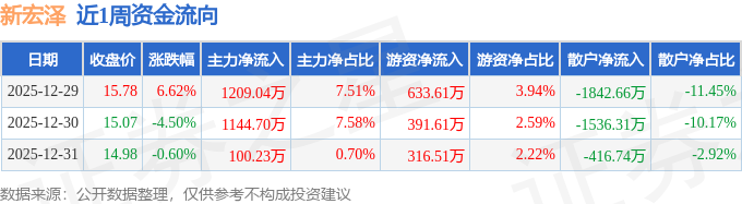 资金流向数据方面,本周新宏泽主力资金合计净流入2453.98万元,游资资金合计净流入1341.73万元,散户资金合计净流出3795.71万元。本周资金流向一览见下表: