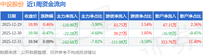 资金流向数据方面,本周中设股份主力资金合计净流出375.86万元,游资资金合计净流出28.06万元,散户资金合计净流入403.92万元。本周资金流向一览见下表: