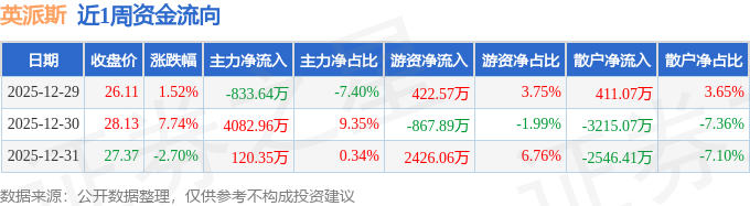资金流向数据方面,本周英派斯主力资金合计净流入3369.68万元,游资资金合计净流入1980.73万元,散户资金合计净流出5350.41万元。本周资金流向一览见下表: