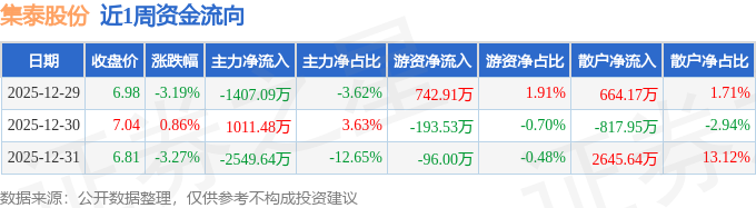 资金流向数据方面,本周集泰股份主力资金合计净流出2945.25万元,游资资金合计净流入453.38万元,散户资金合计净流入2491.87万元。本周资金流向一览见下表: