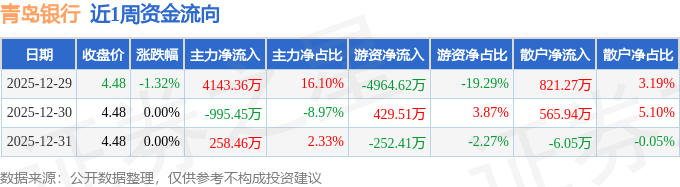 证券之星消息,截至2025年12月31日收盘,青岛银行(002948)报收于4.48元,较上周的4.54元下跌1.32%。本周,青岛银行12月29日盘中最高价报4.54元。12月30日盘中最低价报4.44元。青岛银行当前最新总市值260.75亿元,在城商行板块市值排名12/17,在两市A股市值排名760/5181。