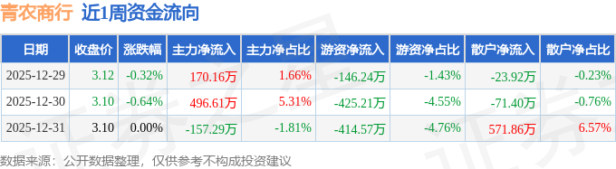 资金流向数据方面,本周青农商行主力资金合计净流入509.47万元,游资资金合计净流出986.02万元,散户资金合计净流入476.54万元。本周资金流向一览见下表: