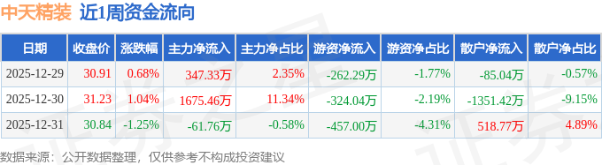 资金流向数据方面,本周中天精装主力资金合计净流入1961.03万元,游资资金合计净流出1043.33万元,散户资金合计净流出917.7万元。本周资金流向一览见下表:
