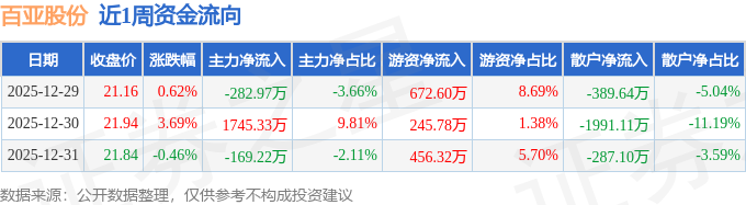 资金流向数据方面,本周百亚股份主力资金合计净流入1293.14万元,游资资金合计净流入1374.7万元,散户资金合计净流出2667.84万元。本周资金流向一览见下表:
