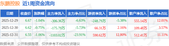 证券之星消息,截至2025年12月31日收盘,东鹏控股(003012)报收于6.55元,较上周的6.74元下跌2.82%。本周,东鹏控股12月29日盘中最高价报6.75元。12月31日盘中最低价报6.53元。东鹏控股当前最新总市值75.78亿元,在家居用品板块市值排名19/73,在两市A股市值排名2440/5181。