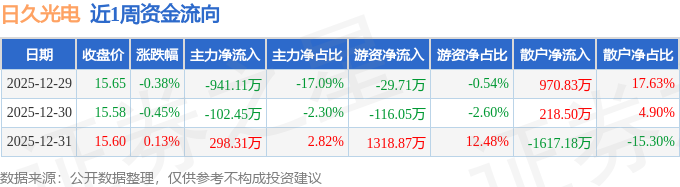 资金流向数据方面,本周日久光电主力资金合计净流出745.25万元,游资资金合计净流入1173.11万元,散户资金合计净流出427.86万元。本周资金流向一览见下表:
