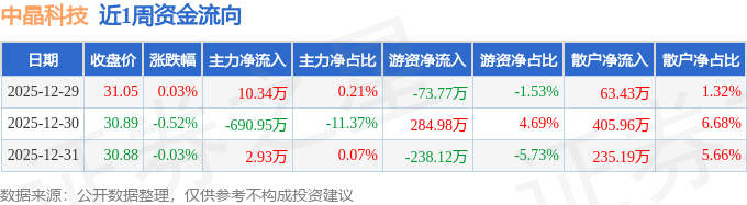 资金流向数据方面,本周中晶科技主力资金合计净流出677.68万元,游资资金合计净流出26.91万元,散户资金合计净流入704.59万元。本周资金流向一览见下表: