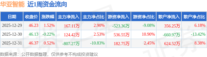 资金流向数据方面,本周华亚智能主力资金合计净流出515.74万元,游资资金合计净流入195.95万元,散户资金合计净流入319.79万元。本周资金流向一览见下表: