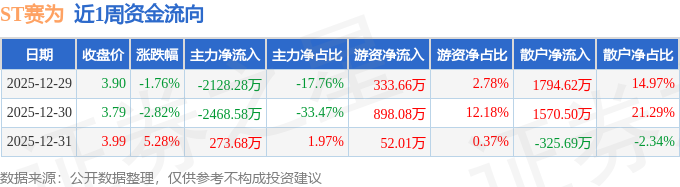 资金流向数据方面,本周ST赛为主力资金合计净流出4323.18万元,游资资金合计净流入1283.75万元,散户资金合计净流入3039.43万元。本周资金流向一览见下表: