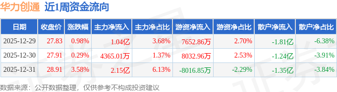 资金流向数据方面,本周华力创通主力资金合计净流入3.63亿元,游资资金合计净流入7668.98万元,散户资金合计净流出4.39亿元。本周资金流向一览见下表: