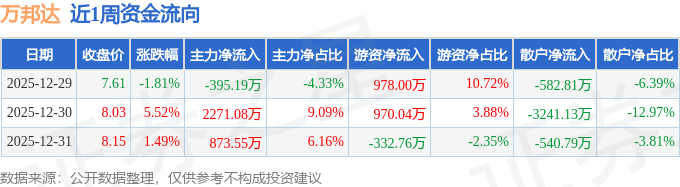 资金流向数据方面,本周万邦达主力资金合计净流入2749.45万元,游资资金合计净流入1615.28万元,散户资金合计净流出4364.73万元。本周资金流向一览见下表: