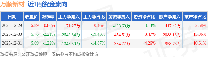 资金流向数据方面,本周万顺新材主力资金合计净流出3814.86万元,游资资金合计净流入350.59万元,散户资金合计净流入3464.27万元。本周资金流向一览见下表: