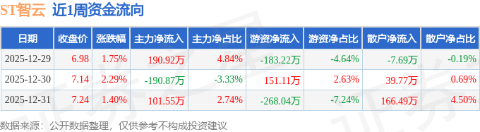 资金流向数据方面,本周ST智云主力资金合计净流入101.59万元,游资资金合计净流出300.16万元,散户资金合计净流入198.57万元。本周资金流向一览见下表: