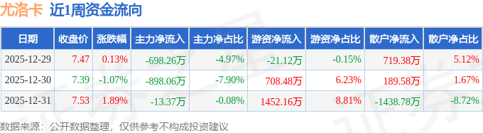 资金流向数据方面,本周尤洛卡主力资金合计净流出1609.69万元,游资资金合计净流入2139.51万元,散户资金合计净流出529.82万元。本周资金流向一览见下表: